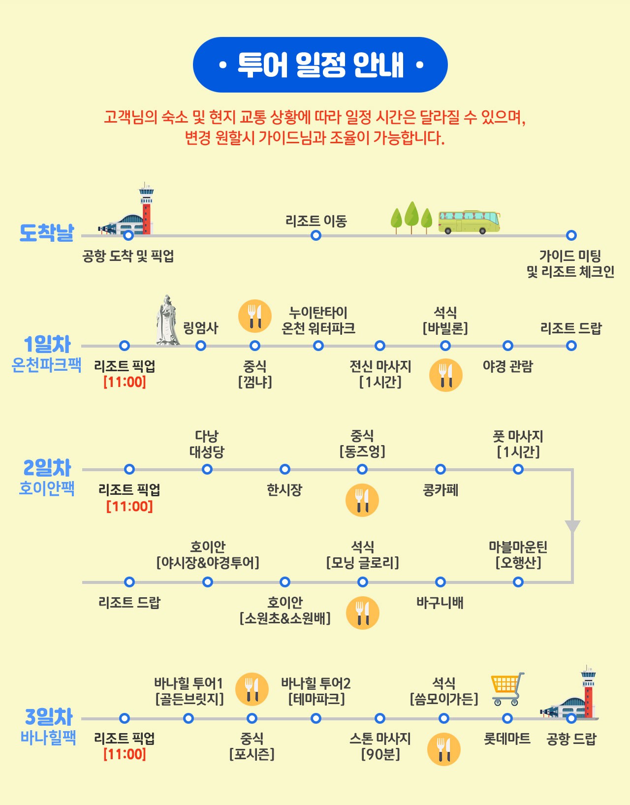 ※ 다낭시내 기준 외 또는 호이안에서 출발 시 차량 추가 비용 $20 발생됩니다.