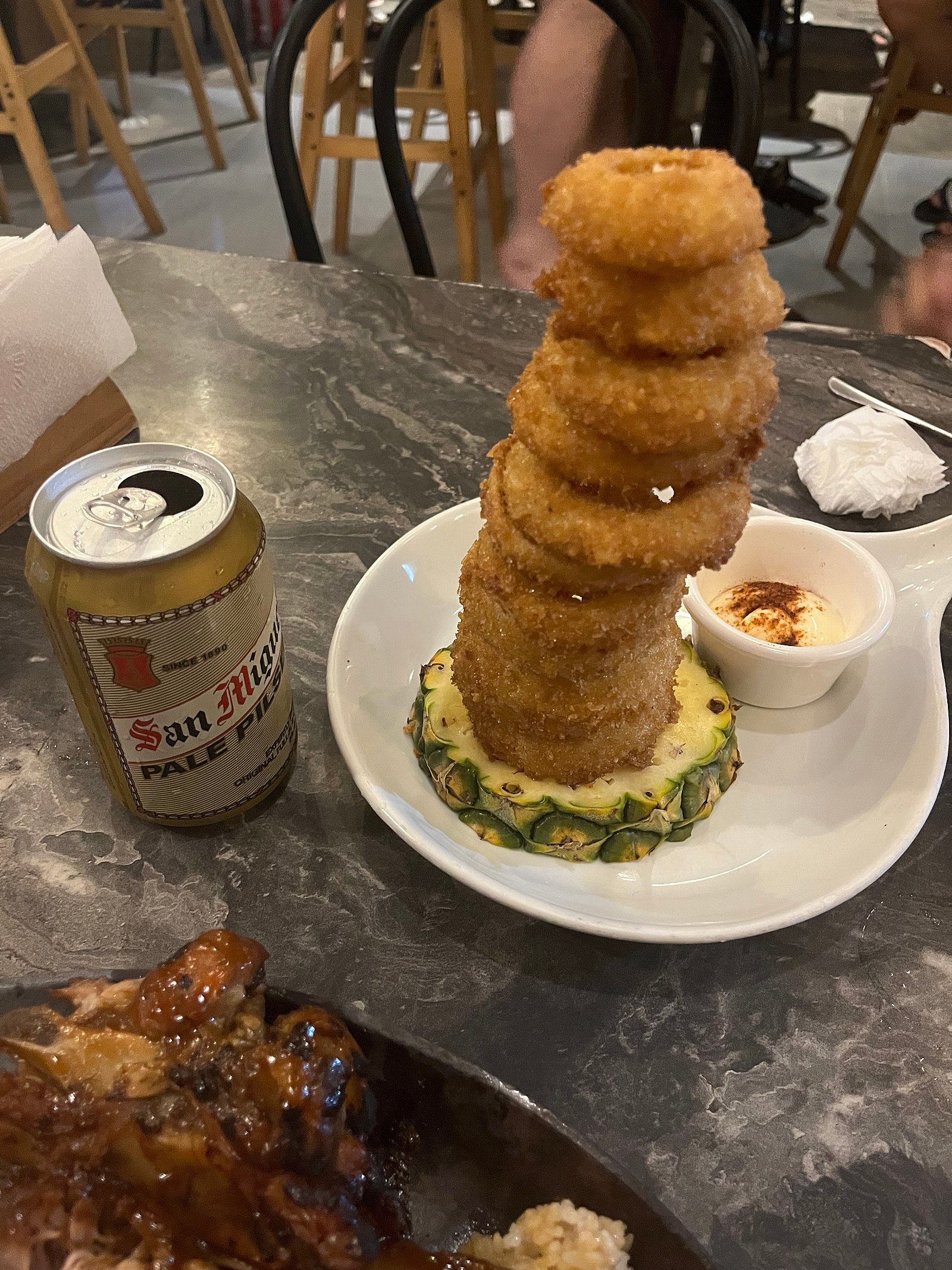 저녁먹으러 아기돼지백립이랑 양파튀김!