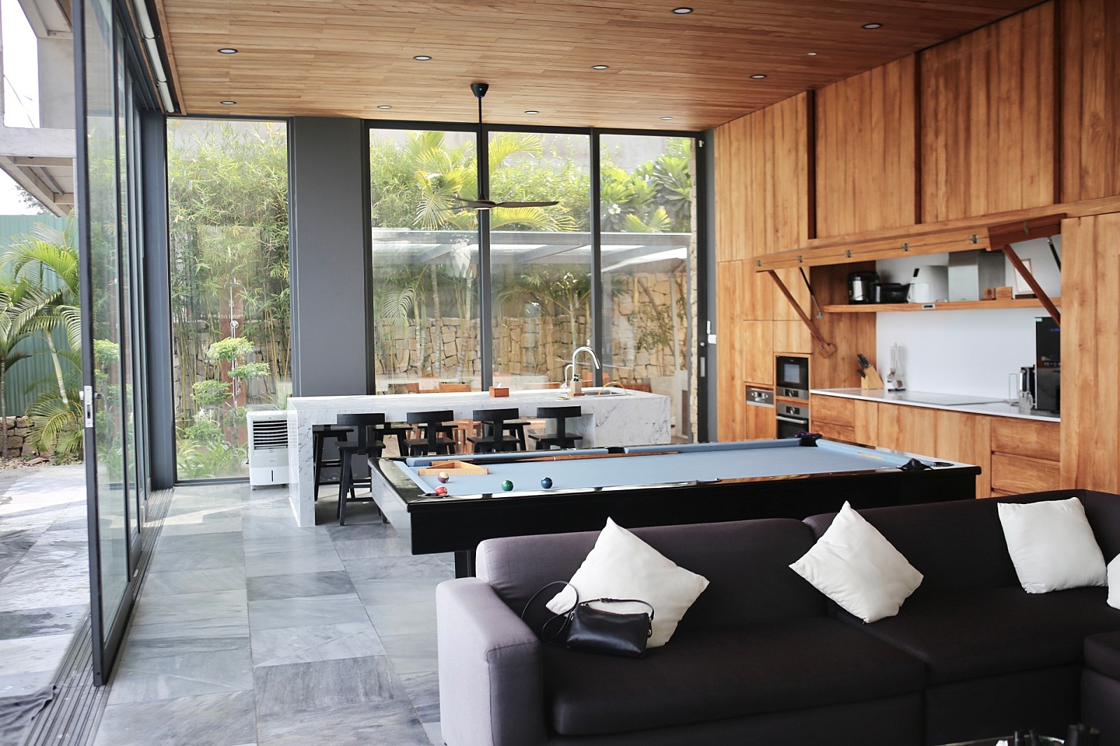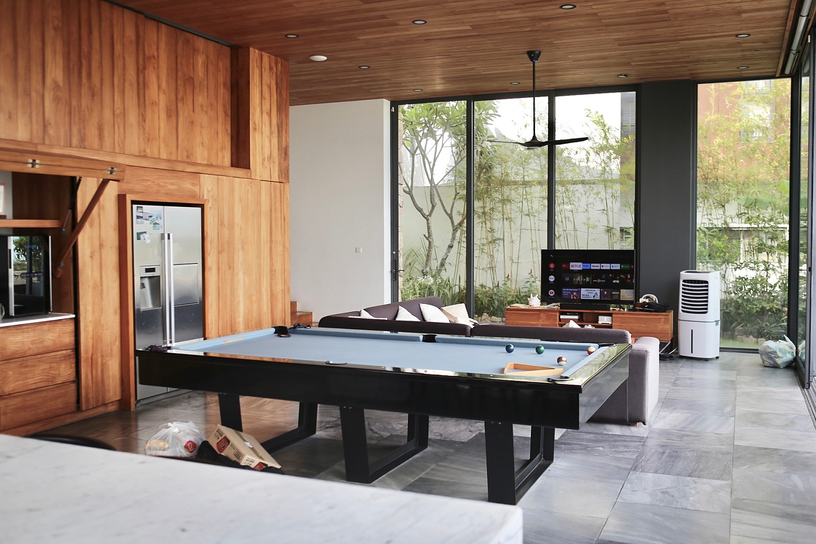 주방겸 거실이 정말 넓고 왼편에 바로 수영장이 있어요
