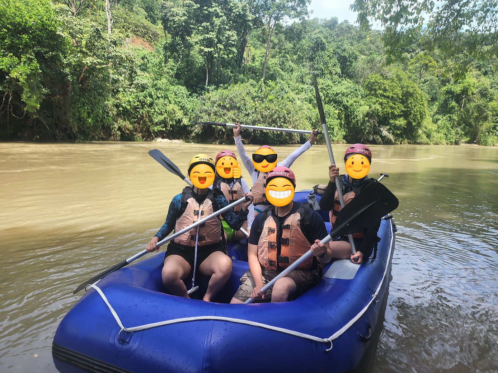 저희는 래프팅을 신청하여 산에 올라가가 1시간-1시간 30분 정도의 래프팅을 했어요!