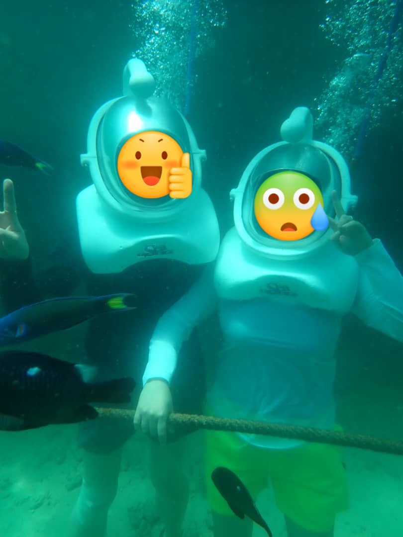 저 머리에 쓴 것은 산소탱크와 같은 역할인데 신기하게 어깨 위로는 물이 안 차올라서 숨쉬기 수월했어요