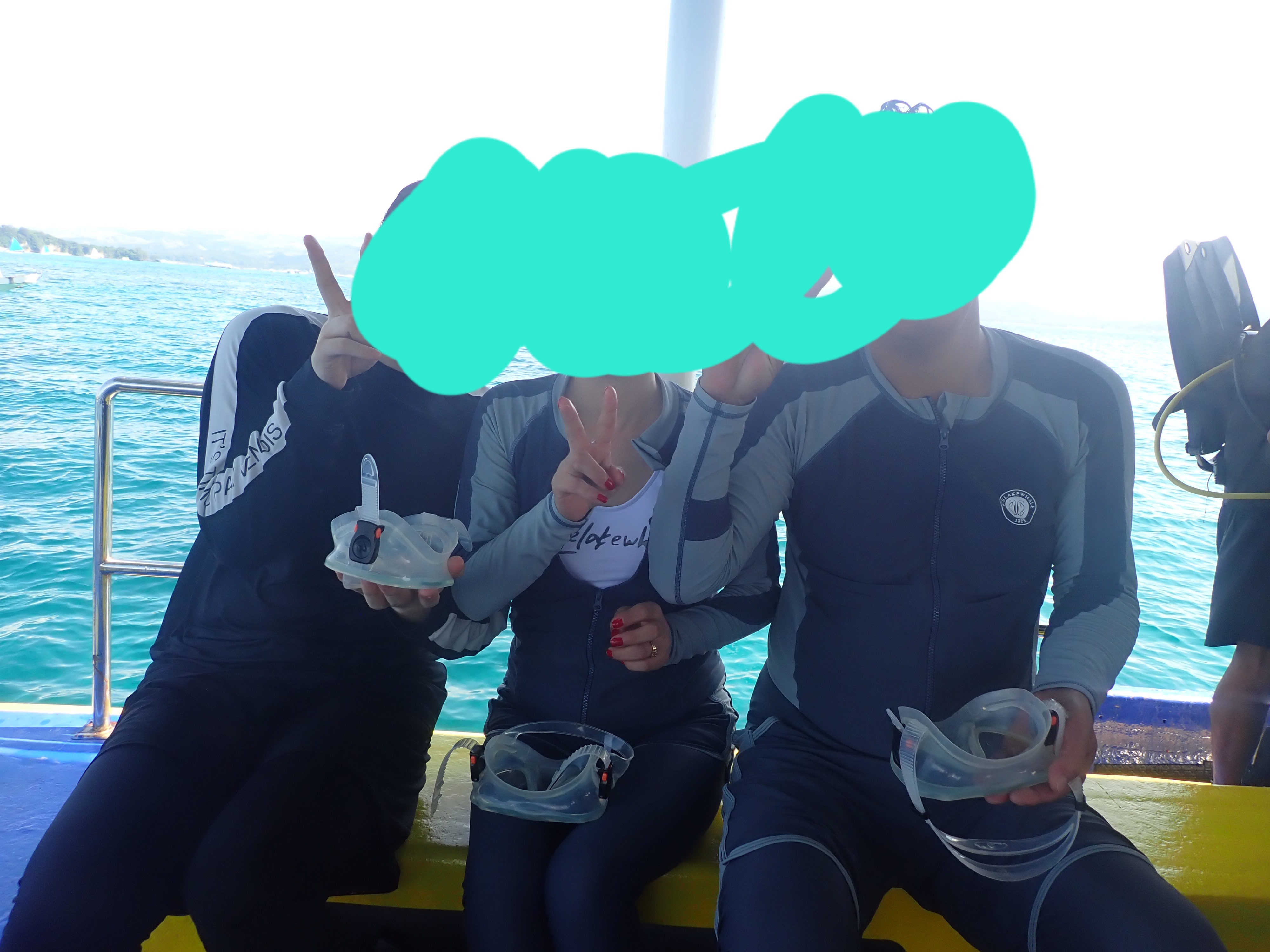 식사를 하고 배를 탄 후 이동하면서 스노클링에 도전하기 위해 저희는 덜덜떨고 있었어요.