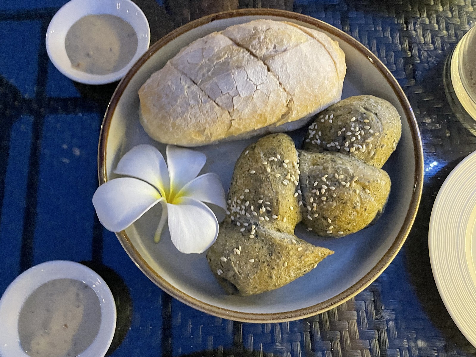 샹그릴라 로비와 룸에서 본 뷰, 조식야외테이블, 조식에 있던 빵 사진입니다