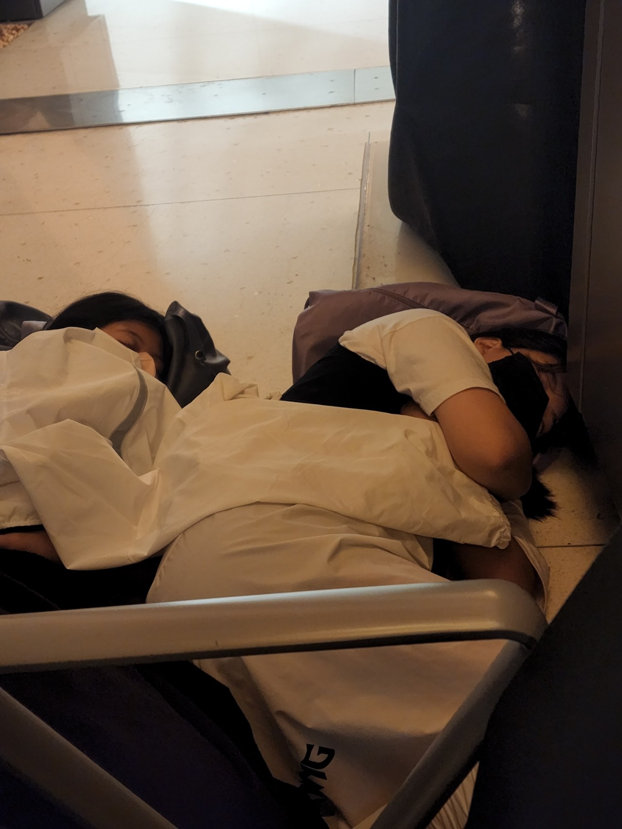 새벽 한시 비행기라 한참 웃다가 피곤해진 딸들은 바닥에 옷을 깔고 눈을 좀 붙였어요.