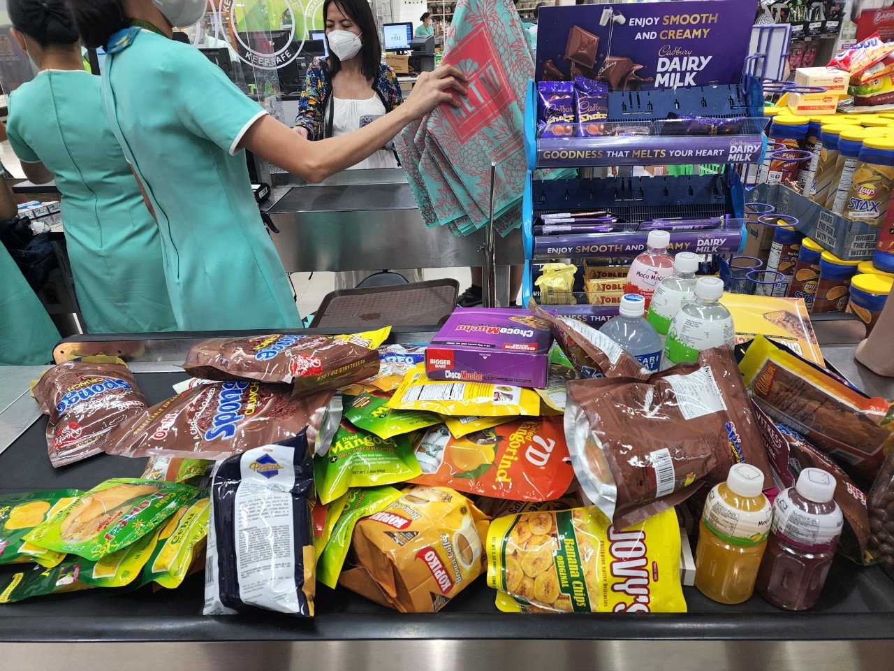 한국 사람들이 많이 산다는 건망고와 초코과자, 바나나칩, 코코넛칩, 비누와 헤어에센스를 샀어요.
