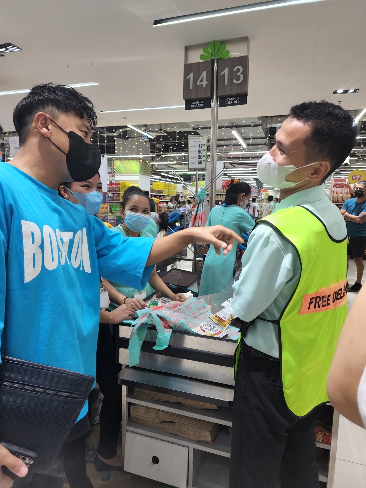 계산할 때 대박이었는데 아론 삼촌이 '프리 딜리버리'라 적힌 조끼를 입고 있는 직원한테
