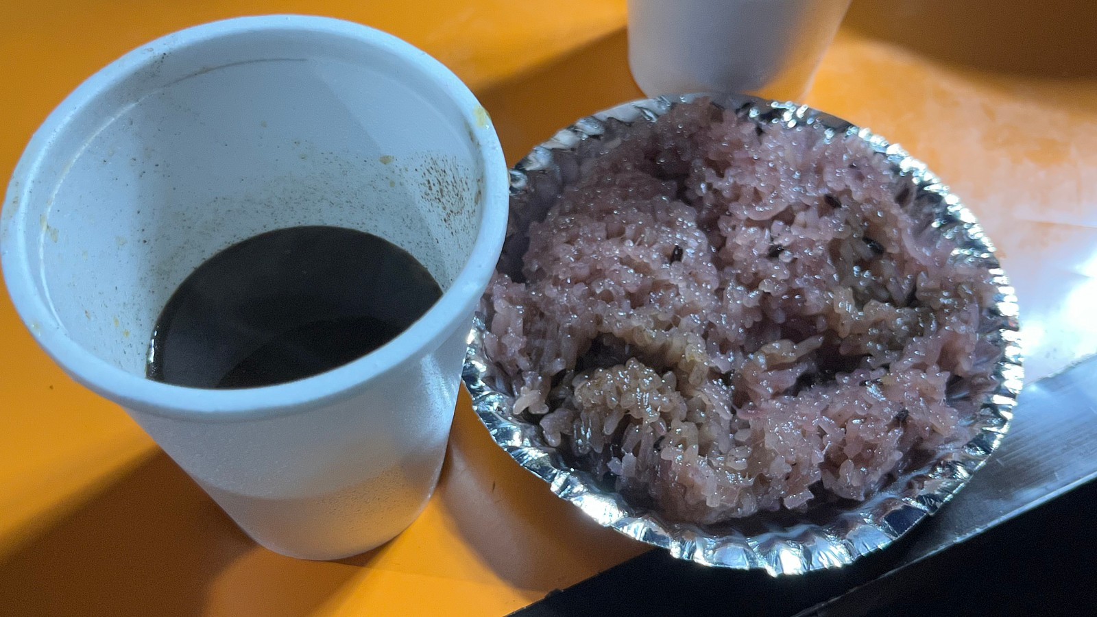 필리핀 현지인들의 단골 아침식사 메뉴인데, 떡 같은 찹쌀밥과 초코라떼를 함께 먹는 음식이라고 하셨어요.